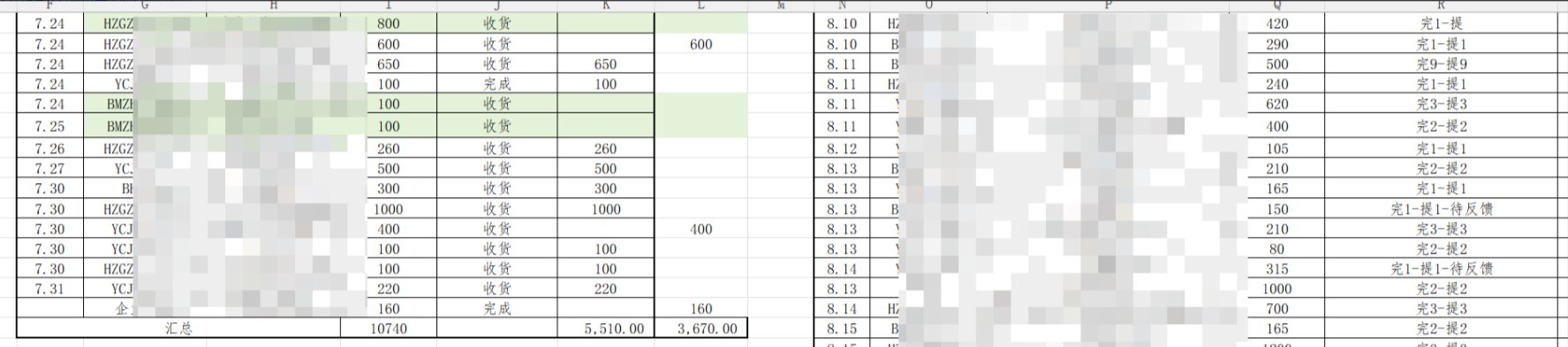 下图是部分业务的订单截图。这是我在 excel 中记录的订单日期、编号、项目名称、金额、提交状态和结算情况。