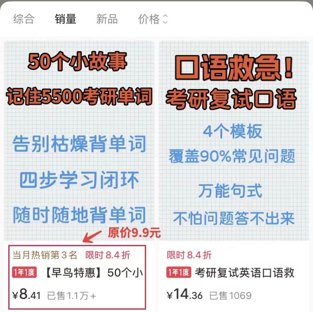他的产品标题特别吸睛:“50个小故事快速记住5500个考研单词”,换谁看到都会心动,别说9.9元,真能轻松记单词,990元都愿意花。